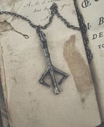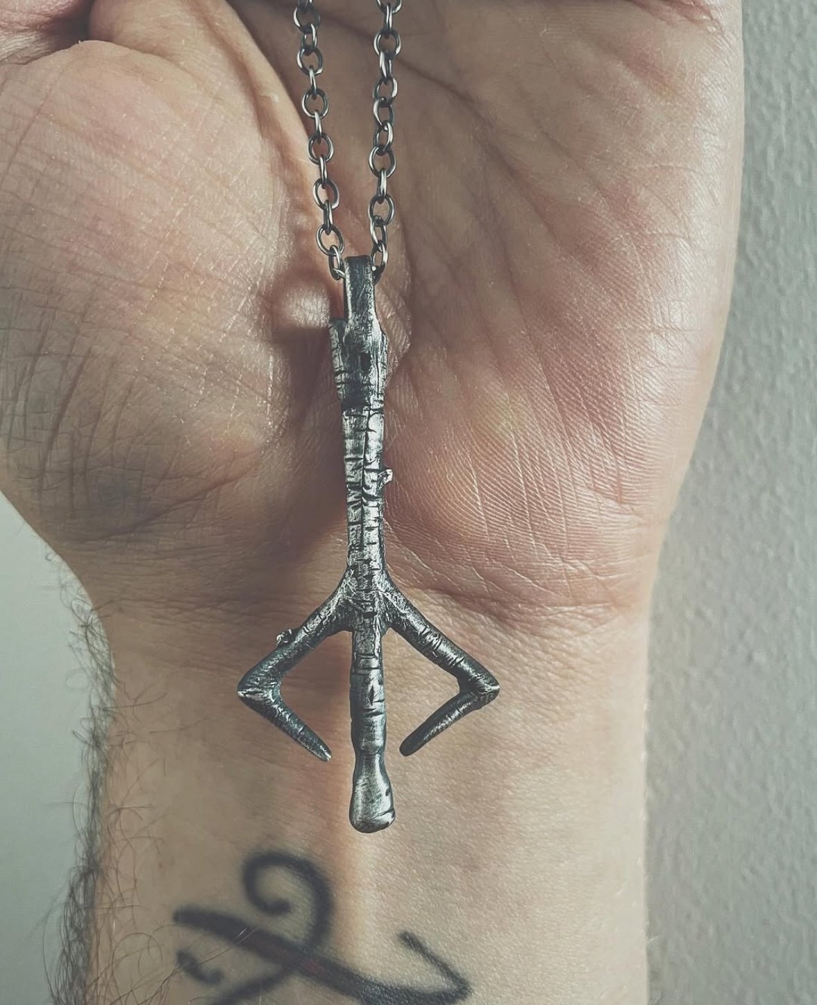 The hand formed symbol has been highly textured then darkened and buffed to add to its dark and rustic look.